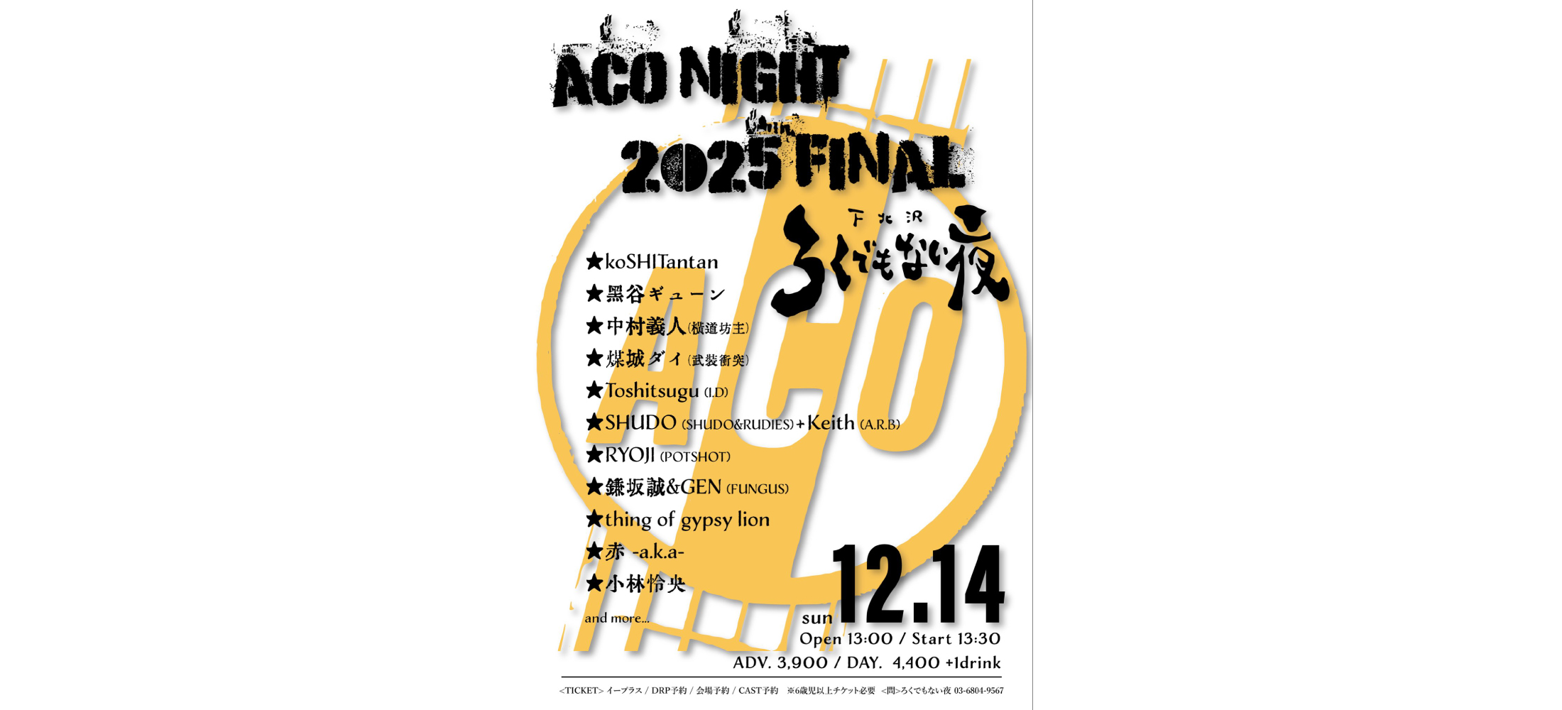 SCHEDULE 2025年12月14日(日)@下北沢 ろくでもない夜 ※RYOJI 弾き語り "ACO NIGHT 2025 FINAL" 出演 :koSHITantan黒谷ギューン中村義人(横道坊主)煤城ダイ(武装衝突)Toshitsugu(I.D)SHUDO(SHUDO&RUDIES)+Keith(A.R.B)鎌坂誠&GEN(FUNGUS)thing of gypsy lion赤-a.k.a-小林怜央RYOJIand more Open 13:00 / Start... 2025.08.01 SCHEDULE