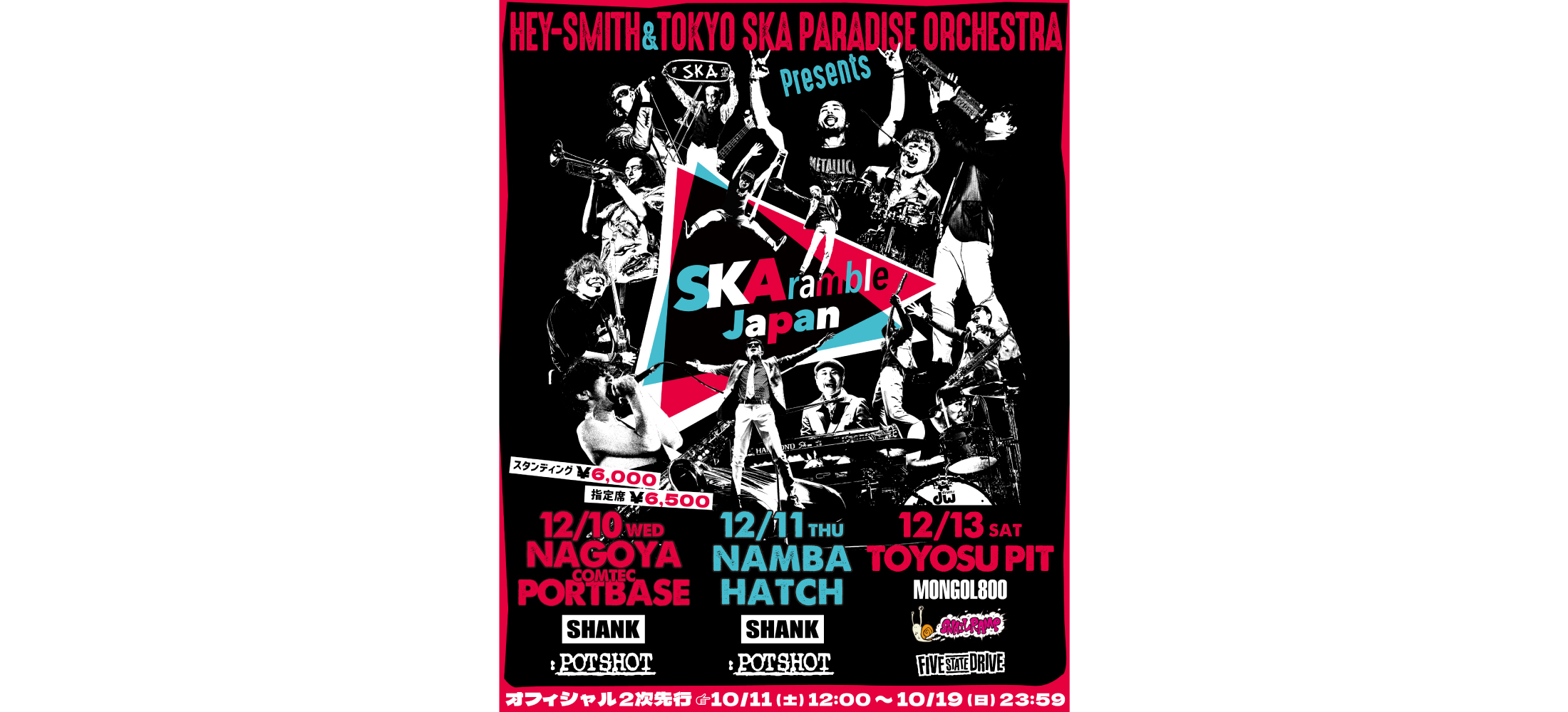 SCHEDULE 2025年12月11日(木)@なんば Hatch ※POTSHOT SKAramble Japan 出演 : HEY-SMITH / 東京スカパラダイスオーケストラSHANK / POTSHOT Open 17:00 / Start 18:00 前売:1Fスタンディング¥6000 / 2F指定席 ¥6500 (ドリンク代別途) Ticket:オフィシャル2次先行 : 10/11(土)12:00 〜 10/19(日)23:59 Inf... 2025.08.01 SCHEDULE