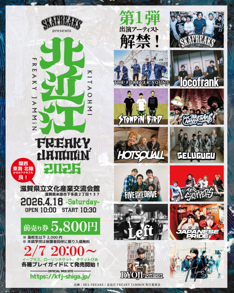 2026年04月18日(土)@北近江 FREAKY JAMMiN’ 2026 ※RYOJI 弾き語り SCHEDULE 2026.02.07 2026.01.10 北近江 FREAKY JAMMiN’ 2026 Open 10:00 / Start 10:30 一般:5,800円 / 高校生以下:2,000円 (ドリンク代別途) Info :Official Web Site https://kfj-shiga.jp